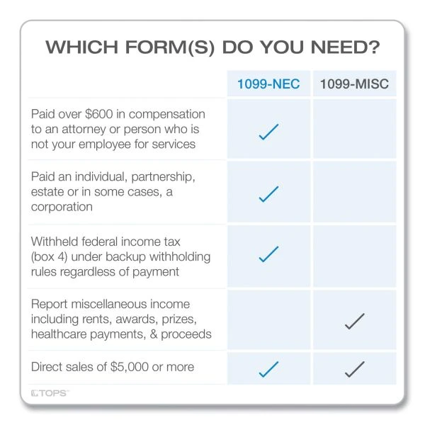 TOPS Five-Part 1099-NEC Tax Forms, Fiscal Year: 2022, Five-Part Carbonless, 8.5 x 3.5, 3 Forms/Sheet, 50 Forms Total – Get IRS Form 1099-NEC for up to 50 recipients. TOPS 1099-NEC pack includes 50, 5-part 1099-NEC sets and three 1096 summary forms. You’ll use the 1099-NEC to report nonemployee compensation for your independent contractors and attorneys. This year there are two reporting updates for the NEC. 1) You can report payer-made sales of $5,000 or more on the NEC in box 2 OR on the MISC in box 7, so fewer filers will need both forms. 2) You can no longer report cash payments for the purchase of fish for resale in NEC box 1. (Use 1099-MISC box 11 instead.) The IRS has reduced the size of the NEC to fit 3 forms per sheet this year, so be certain to grab new NEC envelopes designed to fit 3-up forms.