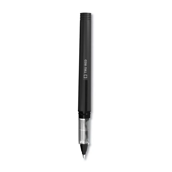 TRU RED Roller Ball Pen, Stick, Fine 0.5 mm, Black Ink, Black Barrel, Dozen – An essential for everyday writing. Matte finish and carbon steel clip provide a professional look. Free-flowing ink system makes it airplane safe, so your pen will not leak during cabin pressure changes.