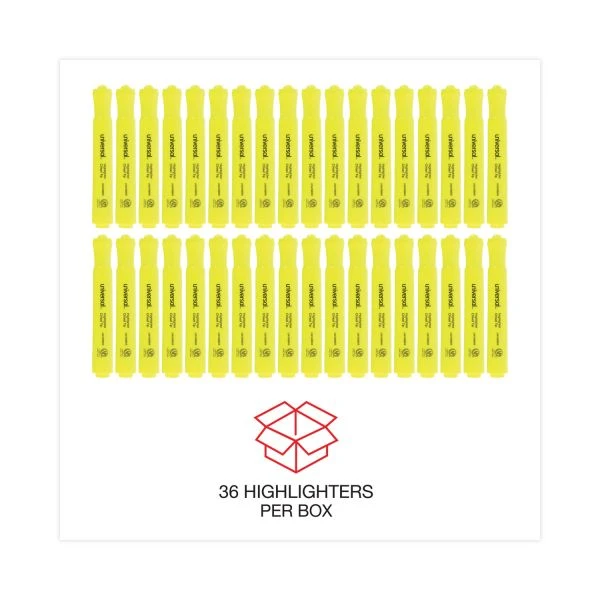 Desk Highlighter Value Pack, Fluorescent Yellow Ink, Chisel Tip, Yellow Barrel, 36/Pack – Universal Desk Highlighters are well-designed highlighting pens that feature bright, vibrant colors. The chisel tip allows for both broad and narrow lines. Large cap holds firmly on either end of the highlighter so it doesn’t get lost. The bright ink stands out on the page, dries quickly, and will not fade. Enjoy effortless highlighting with a smooth barrel that’s easy to hold.