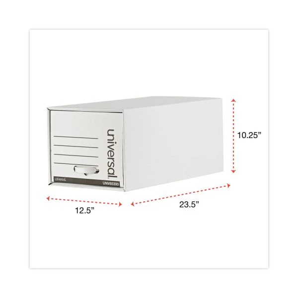 Universal Heavy-Duty Storage Drawers, Letter Files, 14″ x 25.5″ x 11.5″, White, 6/Carton – Strong steel support frame increases stacking strength. Thick, multi-wall drawer panels allow for semi-active use. Automatic shell set-up and drawer assembly—easiest on the market. Reinforced plastic pull handle for convenient access to documents. Stackable up to 5 units high.