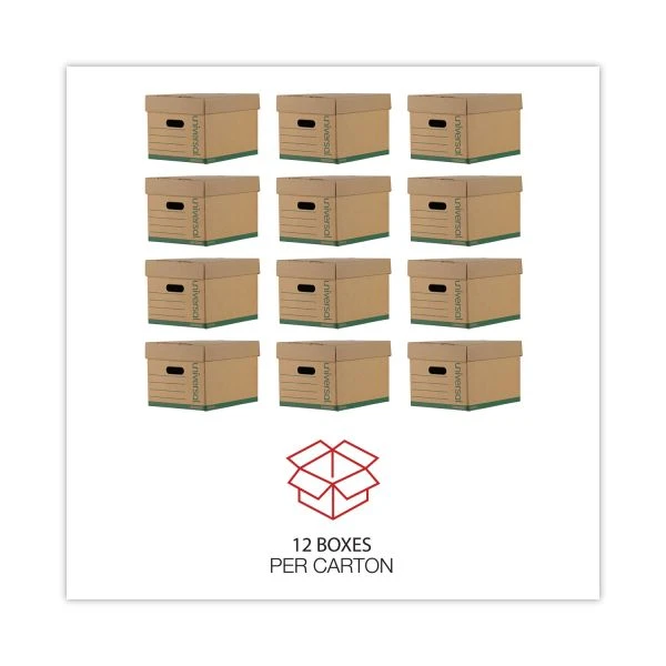 Universal Professional-Grade Heavy-Duty Storage Boxes, Letter/Legal Files, Kraft/Green, 12/Carton – Maximum durability boxes are engineered specifically for active files, harsh environments, and professional records management applications where reliable file storage is critical. The automatic, instant set-up that doesn’t require tape, allows you to get organized quicker. Built with triple panel construction all sides to ensure maximum durability and dependability. 3″ deep detachable, lift-off lid allows you to easily add and remove files when needed.