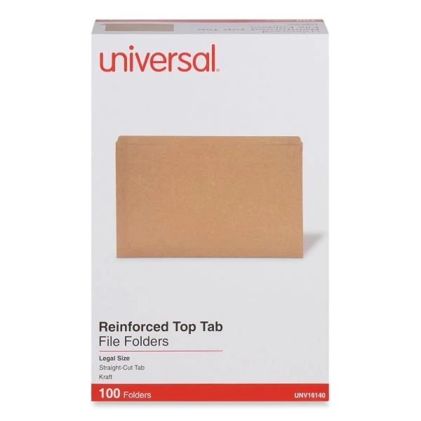 Universal Reinforced Kraft Top Tab File Folders, Straight Tabs, Legal Size, 0.75″ Expansion, Brown, 100/Box – Perfect for active files—strong, 11 pt. stock resists smudging and double-ply tabs put strength where its needed most. Bottom triple-scored for no-sag expansion. Undercut at top for increased indexing area.