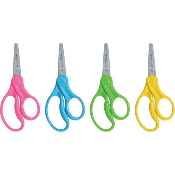 Westcott For Kids Scissors, 5″ Length, 1 3/4″ Cut, Pointed,Blue/Green/Pink/Yellow,30/Pack – Specially designed for a child’s hand, these scissors have durable stainless steel blades. Made for left- and right-hand use.