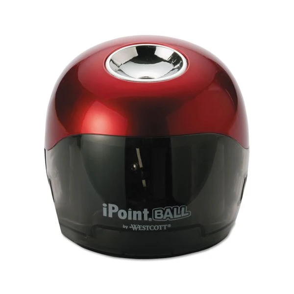 Westcott iPoint Ball Battery Sharpener, Battery-Powered, 3 x 3.25, Red/Black – A unique design that delivers a unique performance. Featuring a proprietary 2-blade technology, the iPoint® Ball sharpens pencils two times faster than other sharpeners in its class. Features Sharp Sense technology that allows you to feel when the pencil is at the optimal point. Safety cut-off when the shavings reservoir is removed. Powered by four AA batteries (sold separately).