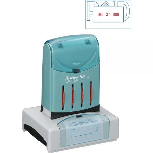 Xstamper ECO-GREEN VersaDater Message Dater, 2.13 x 1.31, PAID, Blue/Red – VersaDater PAID Impression Frame offers a fully pre-inked, eight-year message dater. Re-inkable stamp prints month, day and year. Easily convert to a line dater by removing Impression Frame and snapping onto the line dater frame. All Impression Frames print in blue, and the date prints in red. Impression size is 1-5/16 x 2-1/8″. Stamp contains a high percentage of recycled material.”